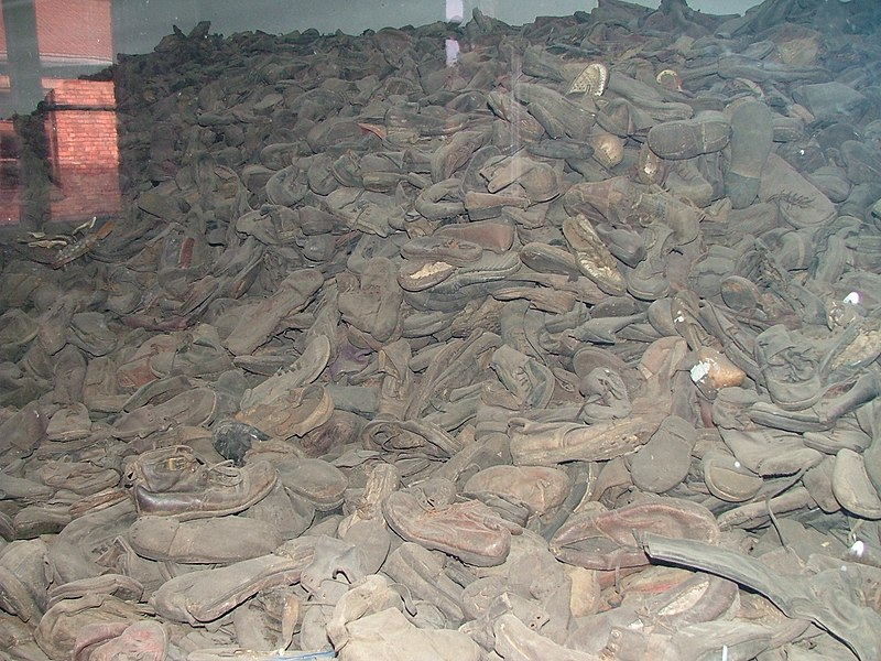 Un morman de pantofi aparținând victimelor expus la Muzeul Auschwitz – o imagine